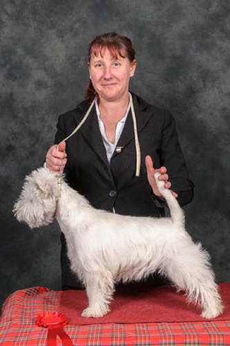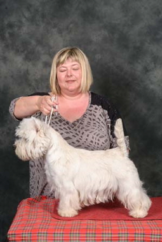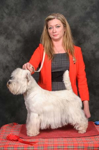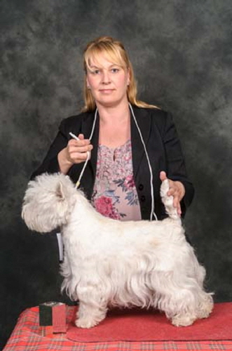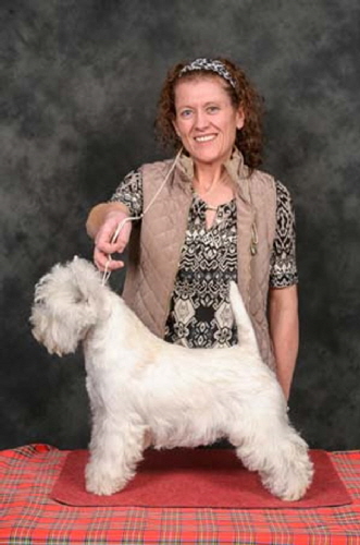 Town Tease is by The Dashing Devil's Street Fighter ex Town Flirt. "Jazz" won her title in 2013 and currently has 9CCs. In 2014 she was Terrier Group#2 at Three Counties and also Best in Show at the Southern WHWT Club Championship show.