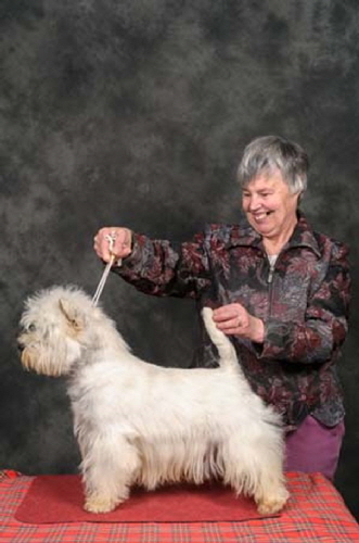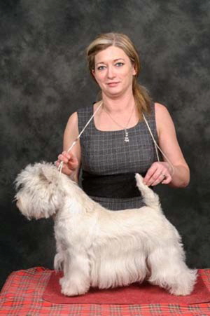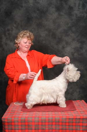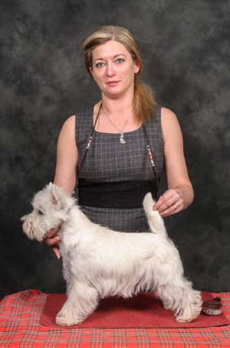 Town Flirt was bred by Tina Squire, by UK/Irish Ch Gilbri Talk Of The Town ex Bellevue Specially Maid. "Kizzy" was the top winning bitch of 2009 and 2010 and the Top Westie 2011. With 28CCs she is the current bitch CC record holder. In 2014, she won a CC at Crufts and was Best in Show at the WHWT Club of England Championship show. Her first litter produced a UK Champion, a CC winner and a Reserve CC winner.